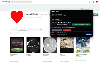 MatchFinder är ett kraftfullt verktyg för att analysera supporterprofiler på Bandcamp. Genom att importera din egen samling och önskelista kan du snabbt filtrera profiler baserat på överensstämmelse med din musiksmak. Verktyget organiserar släpp i tre kategorier: RARE, MEDIUM och LOW, vilket gör att du enkelt kan spara och utvärdera album och låtar. Med globala skydd mot dubbletter säkerställs att din samling förblir unik och växer utan risk för att överskrida tidigare val.